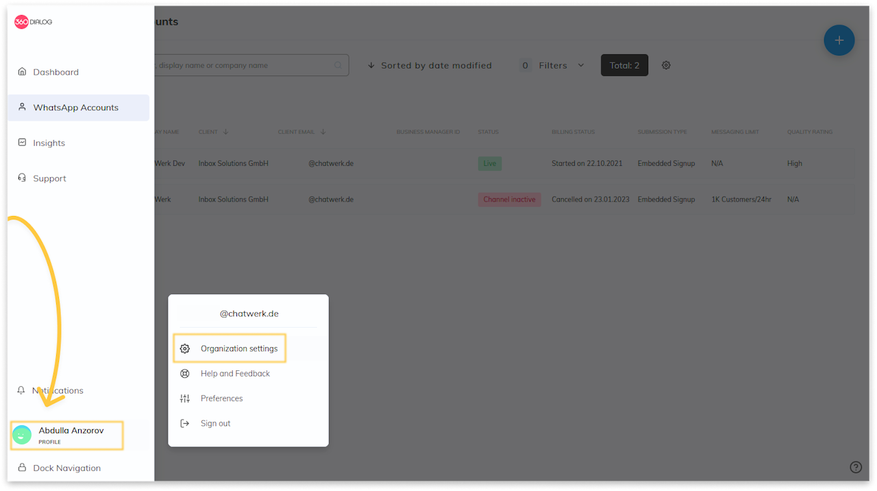 https://hub.360dialog.comKlicke links unten auf dein Profil