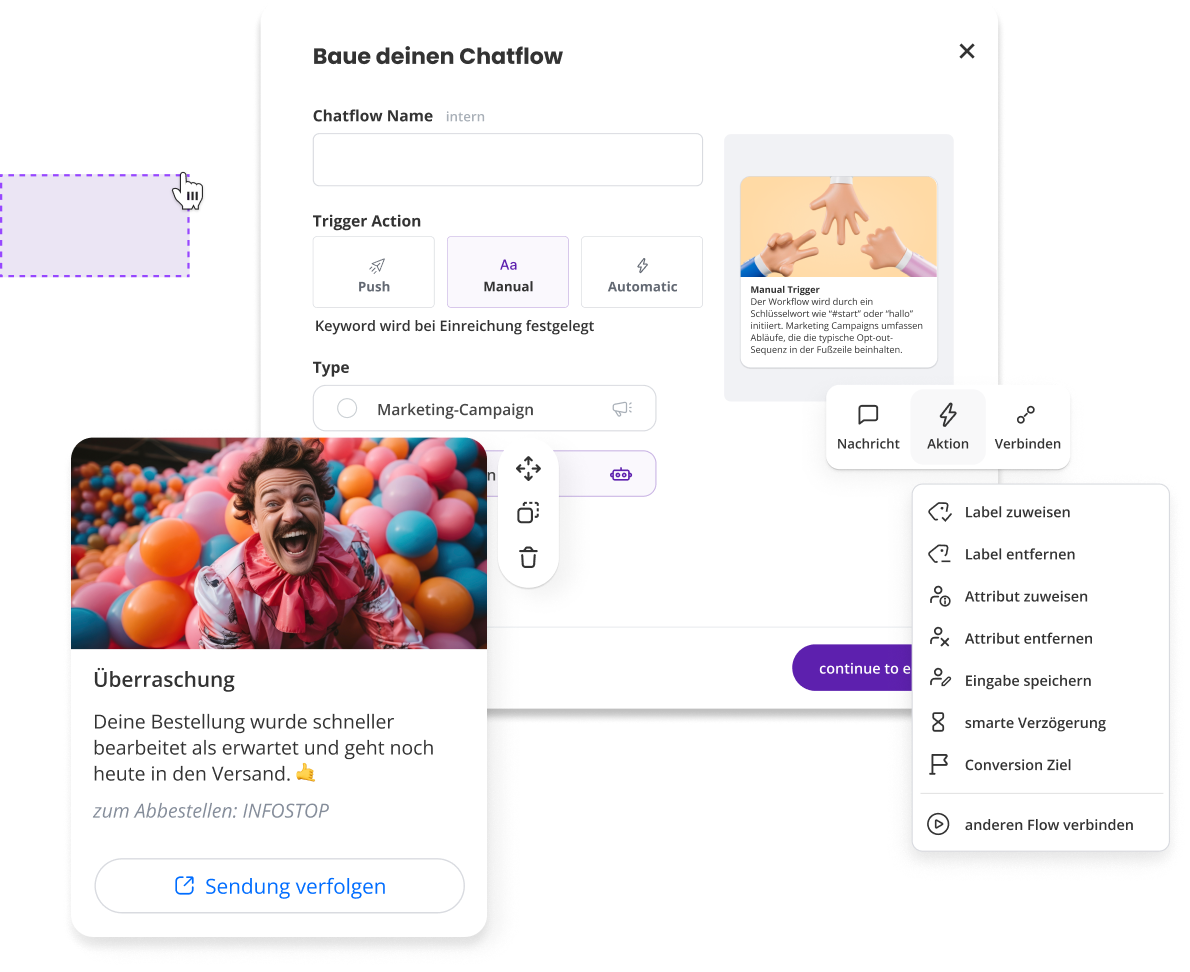 Erstelle automatisierte Marketingkampagnen und Chatbots an einem Ort. Lass deiner Kreativität mit unserem ChatFlow-Builder-Tool freien Lauf.