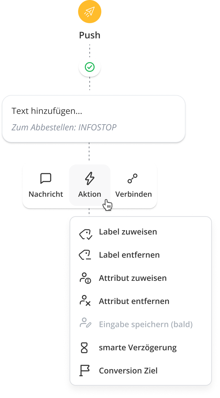 Das kleine Menü, das sich jetzt öffnet, bietet dir die Möglichkeit, eine weitere Nachricht oder Aktion hinzuzufügen oder eine Verbindung zu einer anderen Nachricht herzustellen.