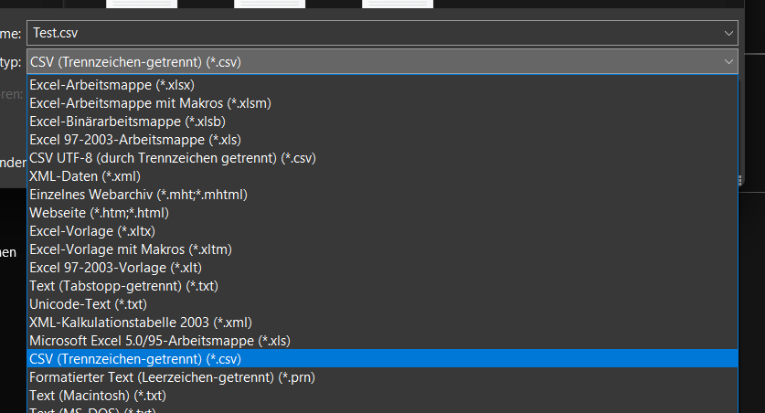 Dateityp: Hier wählt Ihr die Kategorie → CSV (Trennzeichen-getrennt) (*.csv)