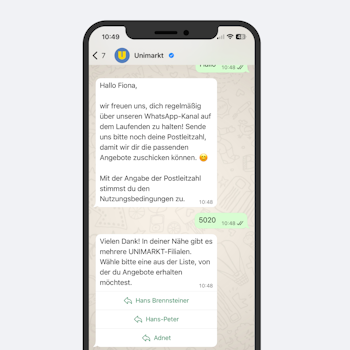 Zeige Kunden nach PLZ-Eingabe die nächstgelegenen Standorte und nutze Labels für gezielte Kampagnen. Add-on im Chatflow Builder