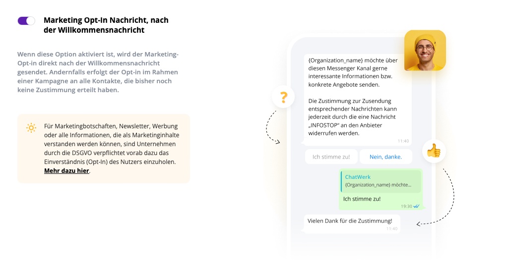 Damit Du dir darüber nicht den Kopf zerbrechen musst, haben wir unser System so gebaut, dass Deine Kundinnen und Kunden automatisch unserem, von Rechtsanwälten geprüften Marketing Opt-In zustimmen müssen, bevor Du ihnen Marketing Nachrichten schicken darfst.