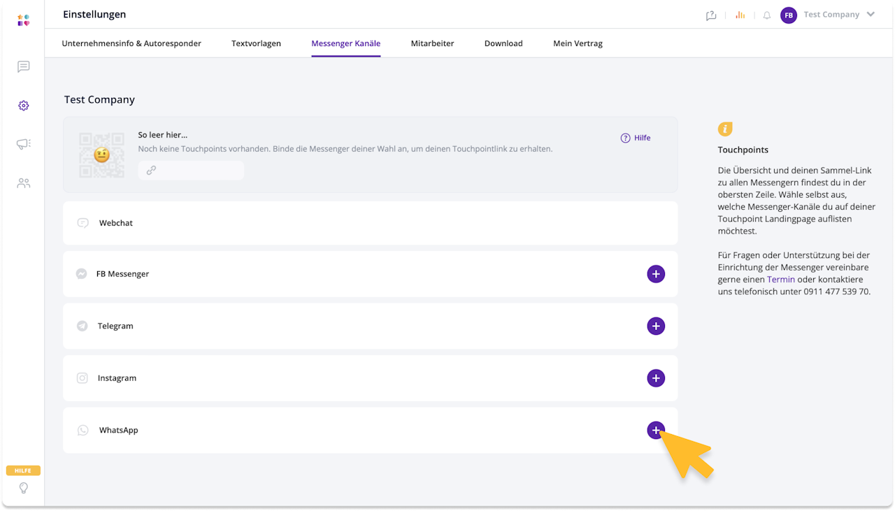 Um mit dem Onboarding deiner Nummer zu starten, melde dich bei deiner Inbox an und klicke links auf Einstellungen⚙️ und oben auf Messenger und dort auf WhatsApp.